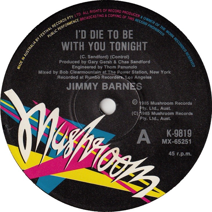Jimmy Barnes released the Single I'd Die To Be With You Tonight in 1985. It was released through the Mushroom label as catalogue number: K 9819