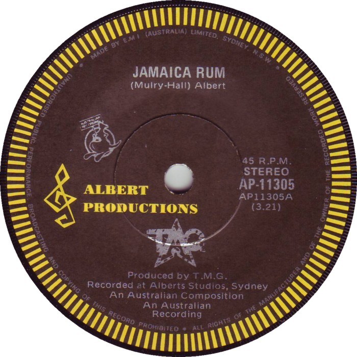 Ted Mulry Gang (TMG) released the Single Jamaica Rum in January 1977. It was released through the Albert Productions label as catalogue number: AP-11305