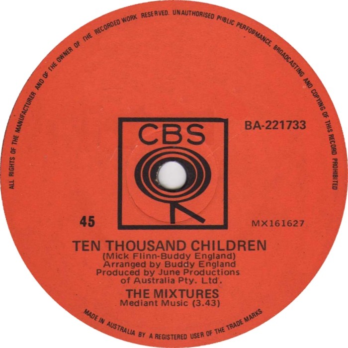 The Mixtures released the Single Ten Thousand Children B/W Call Me Do in 1970. It was released through the CBS label as catalogue number: BA-221733